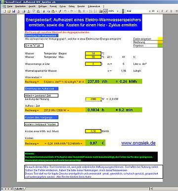 Für die Auswahl, eines Speichers, sollte man viele Faktoren bedenken, unter anderem, die Aufheizzeit. Mit dieser kleinen Excelseite kann man schnell die Zeit bestimmen, in welcher der Speicher aufheizt. Alle wichtigen Parameter können frei variiert werden. Erstellt auf Excel 2003, da aber keine speziellen Verfahrensweisen genutzt wurden, müsste es wahrscheinlich auf allen gängigen Excelversionen laufen. Die Anwendung läuft ohne Makros, und wird hier kostenlos, unter Ausschluss jeglicher Gewährleistung als .xls Datei angeboten. Dateigröße 36 KB. Die Nutzung dieser Anwendung setzt voraus, dass auf ihrem Computer Excel** installiert ist. Die Handhabung empfinde ich als nicht schwierig, allerdings habe ich die Tabelle auch selbst erstellt, sollten Sie als Nutzer das anders sehen, oder auf Unklarheiten, Fehler, usw. stoßen, bin ich immer für einen Hinweis dankbar. Ich setzte aber voraus, dass Sie sich mit dem Thema, der Tabelle, schon etwas auskennen. |