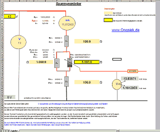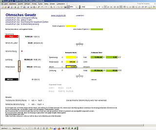 Eine Excelseite mit deren Hilfe man schnell das Ohmsche Gesetz berechnen kann. Erstellt auf Excel 2003, da aber keine speziellen Verfahrensweisen genutzt wurden, müsste es wahrscheinlich auf allen gängigen Excelversionen laufen. Die Anwendung läuft ohne Makros, und wird hier kostenlos, unter Ausschluss jeglicher Gewährleistung als .xls Datei angeboten. Dateigröße 26,5 KB. Die Nutzung dieser Anwendung setzt voraus, dass auf ihrem Computer Excel** installiert ist. Die Handhabung empfinde ich als nicht schwierig, allerdings habe ich die Tabelle auch selbst erstellt, sollten Sie als Nutzer das anders sehen, oder auf Unklarheiten, Fehler, usw. stoßen, bin ich immer für einen Hinweis dankbar. Ich setzte aber voraus, dass Sie sich mit dem Thema, der Tabelle, schon etwas auskennen. |