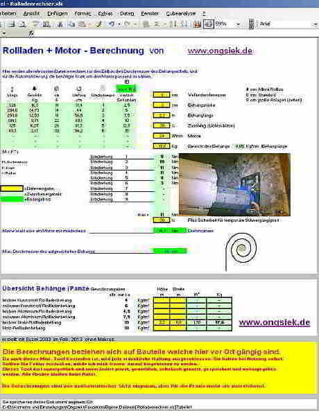 Für die Montage oder Automatisierung eines Rollladens ist es schon hilfreich einige Berechnungen anzustellen. Oder wissen Sie welchen Durchmesser der Rollladen hat wenn er aufgewickelt ist? Welcher Motor mit welcher Stärke wird für welchen Rollladen benötigt? Gut wenn man es schon x Mal gemacht hat, hat man schon eine Idee, aber diese Leute werden dieses hier wohl nicht lesen. Alle wichtigen Parameter können frei variiert werden. Erstellt auf Excel 2003, da aber keine speziellen Verfahrensweisen genutzt wurden, müsste es wahrscheinlich auf allen gängigen Excelversionen laufen. Die Anwendung läuft ohne Makros, und wird hier kostenlos, unter Ausschluss jeglicher Gewährleistung als .xls Datei angeboten. Dateigröße 76 KB. Die Nutzung dieser Anwendung setzt voraus, dass auf ihrem Computer Excel** installiert ist. Hilfestellung können wir aus Zeitgründen leider nicht bieten. Die Handhabung empfinde ich als nicht schwierig, allerdings habe ich die Tabelle auch selbst erstellt, sollten Sie als Nutzer das anders sehen, oder auf Unklarheiten, Fehler, usw. stoßen, bin ich immer für einen Hinweis dankbar. Ich setzte aber voraus, dass Sie sich mit dem Thema, der Tabelle, schon etwas auskennen. |