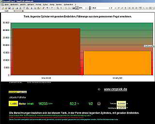 Die Länge (innen) und der Durchmesser (innen) können eingegeben werden. Die einigste Information welche benötigt wird um den Inhalt zu ermitteln ist eine einfache Pegelmessung. Der Inhalt wird als Grafik, in Litern, in %, als Bruch, oder als lachendes oder betrübtes Smiley (Umschaltung bei 50 % Füllmenge), ausgegeben. Die Anwendung wurde auf Excel 2003 erstellt, läuft aber auch - getestet - auf Excel 2007 + 2010. Dateigröße = 196 KB. Die Anwendung läuft ohne Makros, und wird hier kostenlos, unter Ausschluss jeglicher Gewährleistung als .xls Datei angeboten. Die Nutzung dieser Anwendung setzt voraus, dass auf ihrem Computer Excel** installiert ist. Die Handhabung empfinde ich als nicht schwierig, allerdings habe ich die Tabelle auch selbst erstellt, sollten Sie als Nutzer das anders sehen, oder auf Unklarheiten, Fehler, usw. stoßen, bin ich immer für einen Hinweis dankbar. Ich setzte aber voraus, dass Sie sich mit dem Thema, der Tabelle, schon etwas auskennen. |