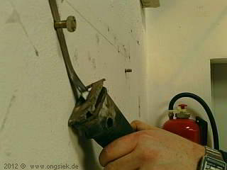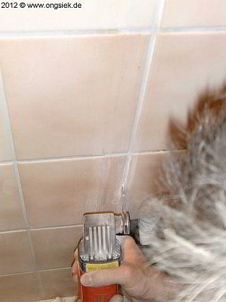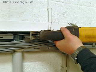 Hier wird eine Gasbetonwand getrennt. Die linke Teilwand wird abgetragen, der rechte Teil des Mauerwerks soll möglichst unbeschadet erhalten bleiben. Da es sich um bewohnte Räume handelt, ist das Vermeiden von Staub sehr wichtig, somit, ist der Einsatz eines Winkelschleifers ausgeschlossen.