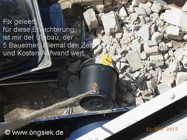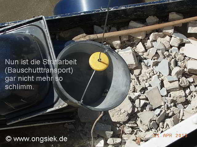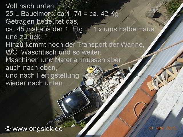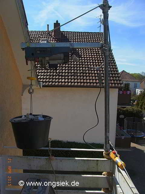 Da wir den Kran wo anders nicht brauchten, haben wir ihn für den Fliesenleger sitzen lassen. Die Fliesenleger haben sicher genauso oder mehr Gewicht damit nach oben transportiert als wir nach unten.