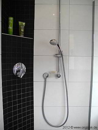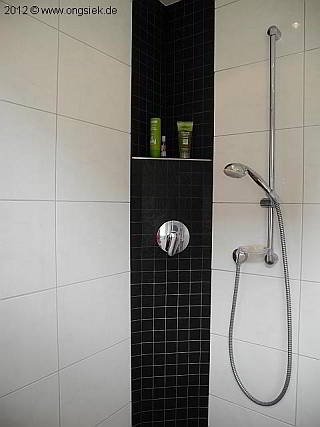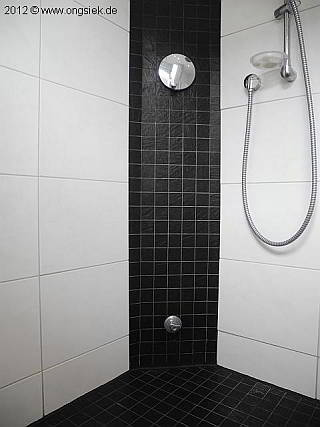 In der bodengleichen Dusche, wurde die Unterputz - Armatur in der Ecke auf 45° montiert, da die Eckabmauerung über der Armatur endet, konnte hier noch eine Ablagefläche realisiert werden. Obwohl diese Eck - Lösung eigentlich eine Notlösung war, hinterlässt der kleine Winkel einen extrem starken Raumeffekt, besonders unterstrichen durch die extreme farbliche Betonung. So wurde aus einer Notlösung ein prägendes Element welches heute keiner mehr missen möchte.