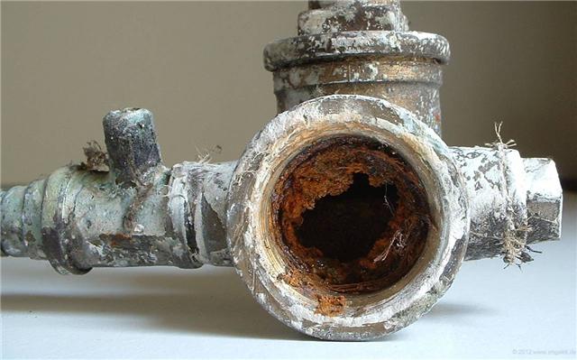 Hier kann man schön erkennen, dass auch neue Rotgußteile in den Abzweigen verkalken wenn sie in die Eiseninstallation eingebaut werden. Die Stömungsrichtung des Wassers war übrigens richtig.