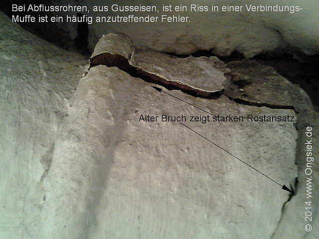 Häufig bilden sich Bruchstellen in Muffen oder Abzweigen, wie Sie im folgenden Bild sehen können. Da das Rohsystem nicht elastisch ist, können sich sehr starke mechanische Spannungen aufbauen. Ob nun durch Gebäudebewegung, Setzvorgänge, unkluge Montage oder harte Schläge, der sehr spröde und harte Grauguss wird reißen. Ist ein Riss vorhanden kommt Korrosion hinzu, das ganze an einer nicht einsehbaren Stelle und das Rohr ist verloren.