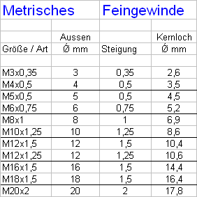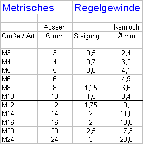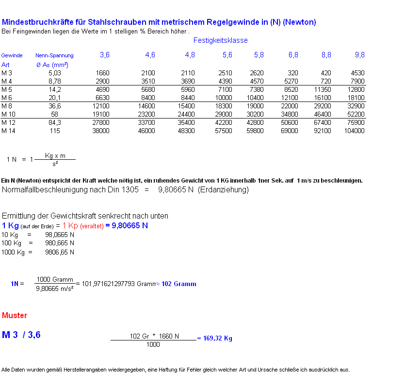 Falls jemand einige Gewinde-Daten benötigt, an Schluss dieser Seite sind einige Tabellen zu Gewinde und Kernloch-Maßen, sowie Mindestbruchlast von Schrauben der gängigsten Größen vorhanden.
