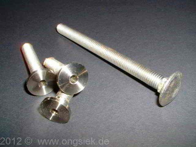 Hier sieht man einige, aus V²A gefertigte Teile, als Basismaterial dienten entsprechende Schlossschrauben, Muster rechts.