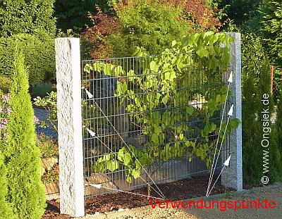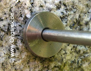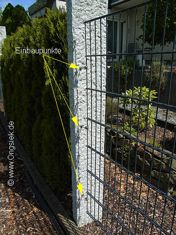 .Das folgende Bild zeigt, eins der, in Granitstelen eingelassen, Drehteile. Deren Aufgabe es von nun an ist, als Gleitlager die Längenänderung des Zaunelementes, oder einer Bodenbewegung, oder bei einer Frosthebungen ausgleichend zu wirken.