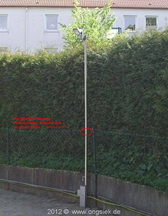 Der Mast wurde einbetoniert und mit einem Rammschutz versehen, da die Leuchte (mit Bewegungsmelder ) den Vorplatz einer Garagenanlage ausleuchtet.