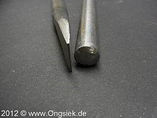 Da oft kleine Meißel in hoher Qualität benötigt werden, kam mir einmal der Gedanke einen Meißel aus einem Silberstahlstab zu schmieden. Ich war überrascht wie gut ein solcher Meißel ist, man kann wenn man den Meißel scharf anschleift auch Stahl damit bearbeiten. Der Verschleiß in Stein ist überschaubar die Beiden hier im Bild zu sehenden sind Nr. 7 + 8. Es macht schon ein wenig Arbeit aber die Qualität spricht für sich.