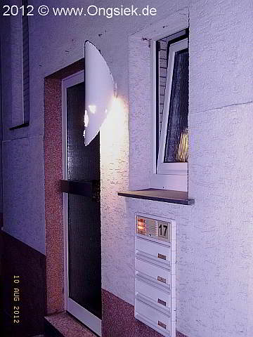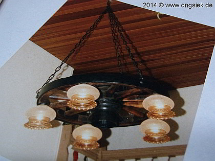 Diese Arbeit wird mir wohl in Erinnerung bleiben, ausgeführt als ich noch Stift (Azubi) war. Ein seiner zeit schon älterer Fuhrunternehmer wollte solch eine Leuchte, da man so etwas nicht fertig kaufen kann, sollte es gebaut werden. Ein Wagenrad, original aus den Anfängen des Fuhrgeschäfts, zu seines Vaters Zeiten, hätte er noch zur Verfügung. Ok, warum nicht? Nur, das Rad war x mal mit grüner Farbe gestrichen, alle Eisenteile waren total verrostet, usw. und so fort. Das Aufhängen der Leuchte war auch nicht so leicht denn das Rad war schon extrem schwer, aber es hat ja geklappt der Mann war zufrieden, was will man mehr. Die Leuchte passt sogar zum Haus, ein kleines Fachwerkhaus am Kirchplatz gelegen. |