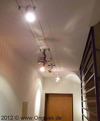 kostete so ein Seilsystem noch richtig viel Geld, die Auswahl der Strahler war zu dem auch noch recht übersichtlich, zu dem ist die Technik auch noch recht simpel, hier lohnte sich ein selbst bauen auf jeden Fall. Gebaut so um 1984, heute (2012) ist das System noch in Betrieb, wenn mal wieder etwas Zeit ist, ist eine Umrüstung auf LED angesagt, geht ja recht einfach.