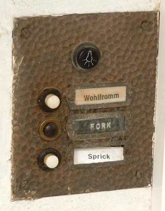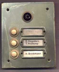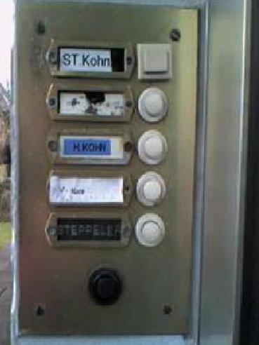 Die Elektriker, die diese Arbeit vor Jahren ausgeführten, nutzten 230V für den Lichttaster im Klingelschild (war wohl in den 50. - 60. Jahren nicht unüblich, oft gesehen). Der Lichttaster aktivierte die Treppenhausbeleuchtung (Verschwendung und sinnlos), nebst Namenschildbeleuchtung auch 230 V ( 230 V nicht zulässig ).