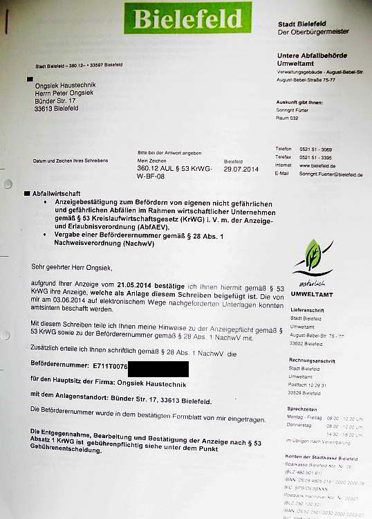 Hier haben wir einmal als Beispiel eine ganz wichtige Genehmigung, für nur € 100,-€ Gebühr + Arbeitszeit, welche mir gestattet meinen Abfall zu entsorgen, besser zu transportieren. Dieser Vorgang besteht aus 16 Seiten einseitig, teils farbig), bedrucktem Din A4 Papieren, teils gebleicht, sicherlich der Umwelt wegen.
