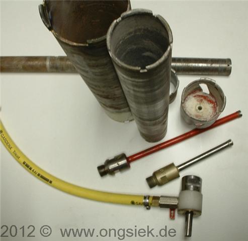 Der Bohrer ist ein dünnwandiges Rohr aus sehr festem vergütetem Stahl mit Schneidzähnen aus einem gesintertem Diamant Stahlgemisch.