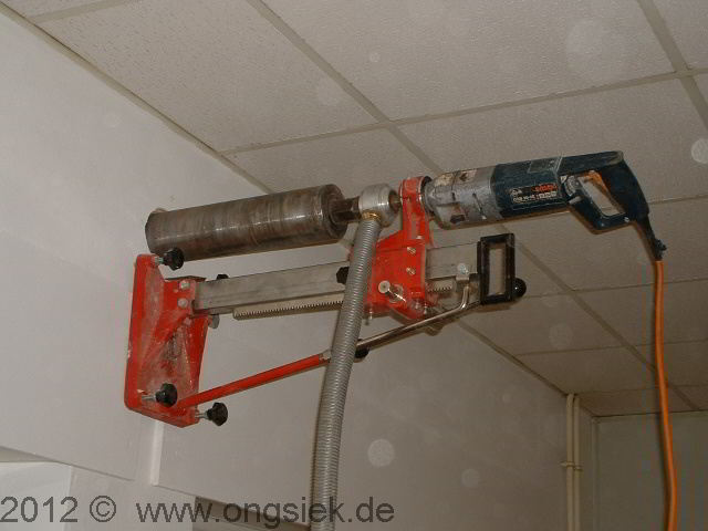 Diamant Kernbohrtechnik ist eigentlich eine wassergespülte Bohrtechnik, allerdings hinterlässt das austretende Wasser Schmutz und Nässe, beides ist für den Wohnbereich kann geeignet. Daher bohren wir trocken mit Staubabsaugung, dieses erhöht den Verschleiß der Bohrkronen zwar erheblich, ist aber ein relativ sauberes Verfahren