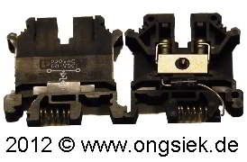 Das Bild, oben, zeigt eine Reihenklemme, welche in ähnlicher Art in vielen gewerblichen Schaltschränken anzutreffen ist. Die Klemme ist hier einmal von rechts und von links abgebildet. Das Besondere an dieser Klemme ist, das eine Überspannungsschutzdiode eingebaut ist.