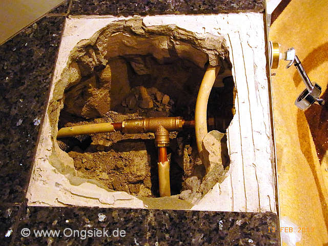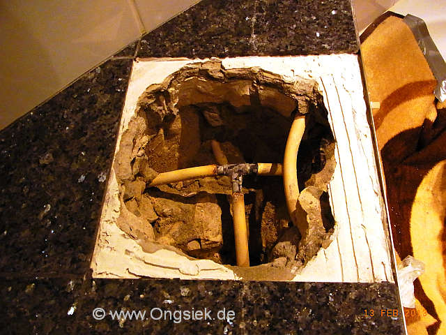 Das freigelegte T-Stück hat es nach ca. 23 Jahren (gem. Eigentümer) erwischt, Lochfraß mit üblen Folgen. Da das Mauerwerk sehr massiv ausgeführt wurde, dauerte es sehr lange, bis der Schaden entdeckt wurde. Das Mauerwerk aus Kalksandstein hat sich mit Wasser völlig vollgesogen.